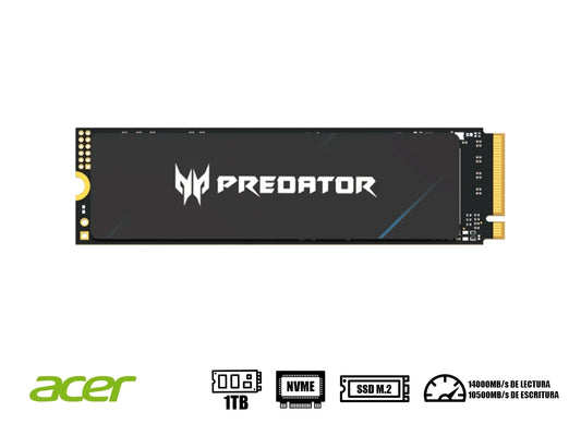 Unidad SSD de alto rendimiento Acer Predator GM7000 con interfaz PCIe Gen4 x4 NVMe. Ofrece velocidades de lectura de 7400 MB/s y escritura de 6400 MB/s, ideal para gaming competitivo y cargas de trabajo exigentes. Formato M.2 2280 compatible con la mayoría de PC y laptops modernas. Capacidad de 1TB...