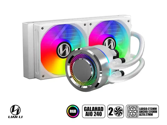 Sistema de enfriamiento líquido all-in-one LIAN LI GALAHAD 240 con diseño compacto de 240mm, ideal para procesadores Intel y AMD de última generación. Cuenta con radiador de aluminio y bloque de cobre de alta conductividad térmica para disipación eficiente. Equipado con dos ventiladores de 800-1900 RPM que generan 69.17 CFM...