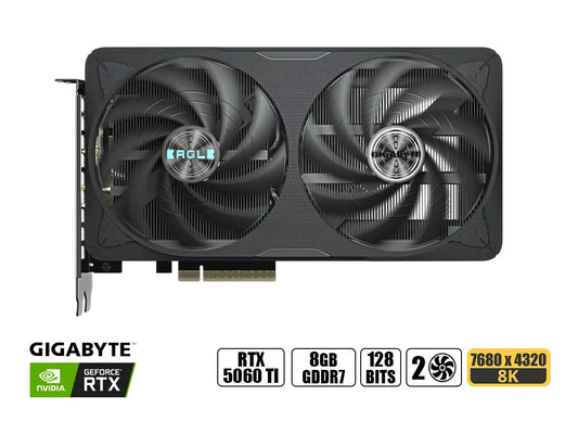 Tarjeta gráfica de alto rendimiento GIGABYTE RTX 5060 Ti EAGLE OC ICE con 4608 núcleos CUDA y 16GB de memoria GDDR7 de 128 bits. Diseñada para gaming en resoluciones ultra altas hasta 7680 x 4320, ofrece conectividad versátil con salida HDMI y triple DisplayPort. Sistema de enfriamiento de doble ventilador...