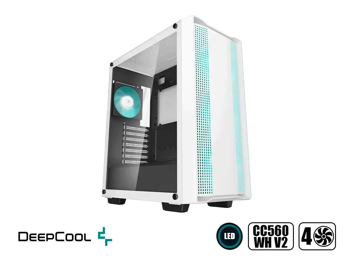 DEEPCOOL CC560 WH V2 – Gabinete Gaming Compacto con Diseño Moderno Gabinete ATX/MicroATX/MiniATX con panel lateral de vidrio templado que exhibe tu configuración. Incluye 4 ventiladores LED preinstalados (3x 120mm frontal + 1x 120mm posterior) para flujo de aire optimizado. Soporta radiadores líquidos hasta 360mm frontal, 240mm superior y 120mm posterior. Ofrece 7 slots de expansión, 4 bahías de almacenamiento (2x 3.5" + 2x 2.5" + 1 adicional) y conectividad frontal con USB 3.0, USB 2.0 y jack de audio. Dimensiones: 432 × 215 × 483 mm. Compatible con gráficas hasta 370mm, procesadores hasta 165mm y fuentes hasta 170mm. Diseño versátil para builds gaming de alto rendimiento.