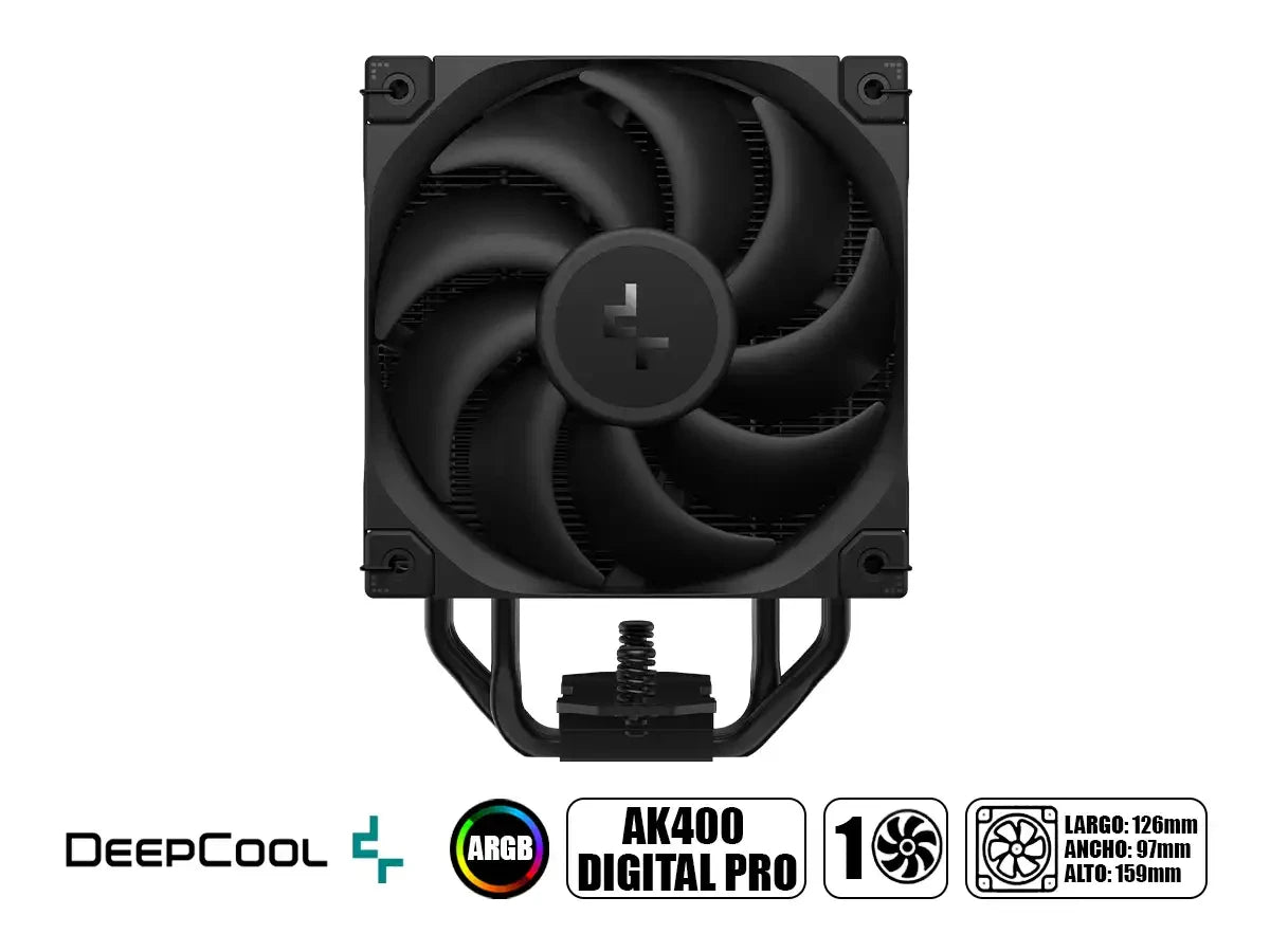 DEEPCOOL AK400 DIGITAL PRO refrigerador de aire de alto rendimiento diseñado para procesadores Intel y AMD de última generación. Cuenta con un ventilador ARGB de 120 mm que opera silenciosamente a ≤25 dB(A), ofreciendo un flujo de aire optimizado de 60.89 CFM con presión estable de 2.91 mmAq. Su base de aluminio y cobre proporciona excelente disipación térmica, mientras que el rodamiento dinámico de fluido garantiza durabilidad y bajo ruido. Compatible con zócalos Intel LGA1851/1700/1200/1151/1150/1155 y AMD AM5/AM4. Iluminación ARGB sincronizable para personalización estética. Construcción compacta de 862 g ideal para builds gaming y workstations profesionales.