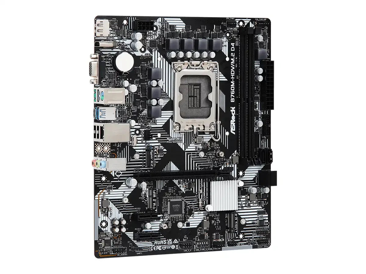 Placa madre Asrock B760M-HDV/M.2 D4 diseñada para procesadores Intel Core de 14ª, 13ª y 12ª generación en socket LGA 1700. Soporta memoria DDR4 hasta 5333 MHz (OC) con dos ranuras para máximo 64 GB. Incluye conectividad PCIe 4.0 x16, almacenamiento con slots Hyper M.2 y Ultra M.2 más cuatro puertos SATA3, USB 3.2 Gen1 Type-C, y salidas de video HDMI, DisplayPort y VGA. Formato Micro-ATX compacto con audio Realtek ALC887/897 y Gigabit LAN integrada. Ideal para sistemas de propósito general y gaming de nivel medio.