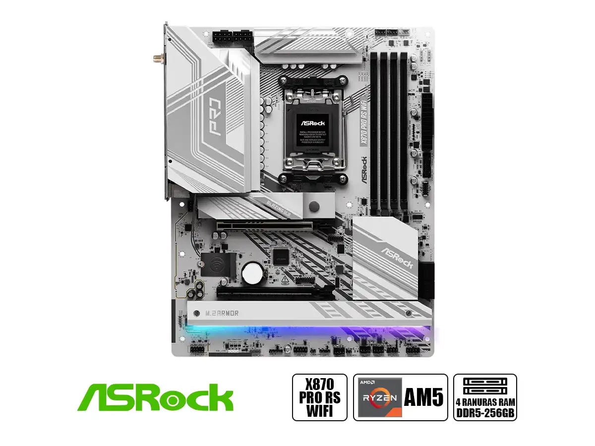 Placa madre ATX de alto rendimiento basada en chipset AMD X870, diseñada para procesadores Ryzen 9000/8000/7000 series en socket AM5. Soporta memoria DDR5 hasta 8000 MT/s (OC) con 4 ranuras para máximo 256 GB. Conectividad avanzada con Wi-Fi 7, Bluetooth 5.4 y 2.5G LAN. Almacenamiento ultrarrápido mediante tres ranuras M.2 (PCIe 5.0, 4.0 y 3.0) más dos SATA3. Puertos USB4 Type-C, múltiples USB 3.2 Gen1 y salidas de video HDMI. Ideal para gaming, streaming y workstations de contenido profesional que demanden máxima velocidad y estabilidad.
