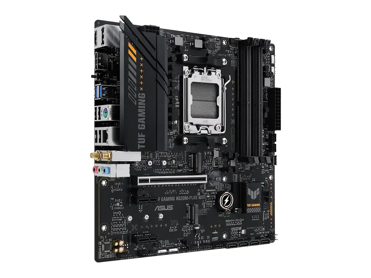 Placa madre Micro-ATX ASUS TUF GAMING A620M-PLUS WIFI con chipset AMD A620 para socket AM5. Compatible con procesadores Ryzen 9000, 8000 y 7000 series. Soporta memoria DDR5 hasta 7600+ MT/s (OC) en 4 ranuras, permitiendo hasta 192 GB. Incluye 2 ranuras M.2 y 4 puertos SATA 6Gb/s para almacenamiento versátil. Conectividad avanzada con Wi-Fi 6, Bluetooth 5.3 y Ethernet 2.5Gb. Audio Realtek 7.1 Surround, puertos HDMI y DisplayPort, más USB 3.2 Gen1 y USB 2.0. Construcción robusta TUF Gaming para estabilidad en gaming y overclocking.
