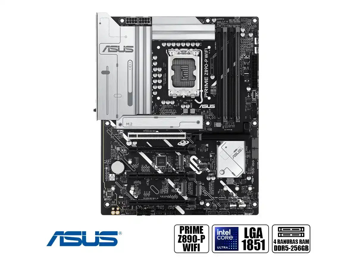 La Placa Madre Asus Z890-P PRIME WIFI, modelo 90mb1i70-m0eay0, ofrece un chipset Intel Z890, socket LGA 1851 y soporta procesadores Intel Core Ultra. Con memoria DDR5 hasta 8666+ (OC) MT/s y múltiples ranuras de expansión y almacenamiento, incluido Thunderbolt 4, Wi-Fi 7 y Bluetooth 5.4, esta placa madre ATX es ideal para construir una poderosa computadora. Dimensiones: 30.5 x 24.4 cm.